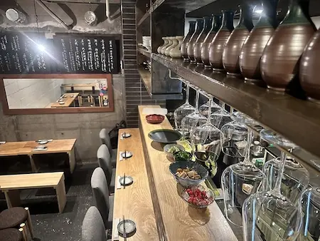 雰囲気抜群の空間には、お洒落なおちょこや小皿が並び、心地よいひとときを演出します