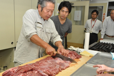 平成24年9月。シカやイノシシの肉を地域資源「くまもとジビエ」として、もっと有効に活用することで被害軽減に繋げていくことを目的に、熊本県が中心となって狩猟に携わる方や関係市町村、県内のレストランの皆さん達と一緒に「くまもとジビエ研究会」を立ち上げ、平成24年度から「くまもとジビエ料理フェア」をはじめ、調理師養成の専門学校である常盤学院さんとのコラボ授業「くまもとジビエ特別授業」やレストランのシェフを招いての産地見学会、福岡でのジビエ商談会、親子モニター試食会など、さまざまな取り組みを行っています。